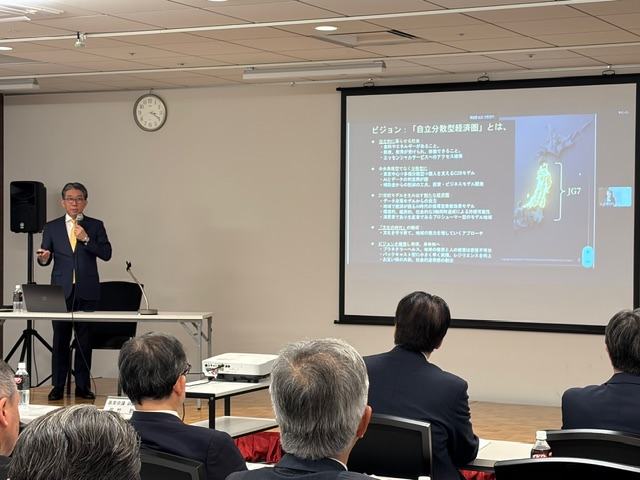 また会議後の講演会では、三菱商事(株)デジタルイノベーションセンター長の平竹雅人氏を講師に招き、「新しい未来を作りだそう」をテーマに講演いただきました。平竹氏は、日本の抱える課題は地方をより良くすることで解決に向かうと考え、センター開設に併せて会津若松市に家族を伴い転勤、家族の視点も得ながら地方発のデジタル技術を活用した新たなプロジェクトやビジネスモデルの実証を行っています。今回の講演では、世界銀行や内閣官房での経験も踏まえ、東北6県と新潟県が一体となって新しい未来を切り拓くための「自立分散型経済圏」の構築を提唱、そのためのビジョン設定や異分野連携によるイノベーションの重要性、また東北の特徴である食料とエネルギーの優位性を踏まえた持続可能な新たな経済圏構築などをお話しいただきました。
